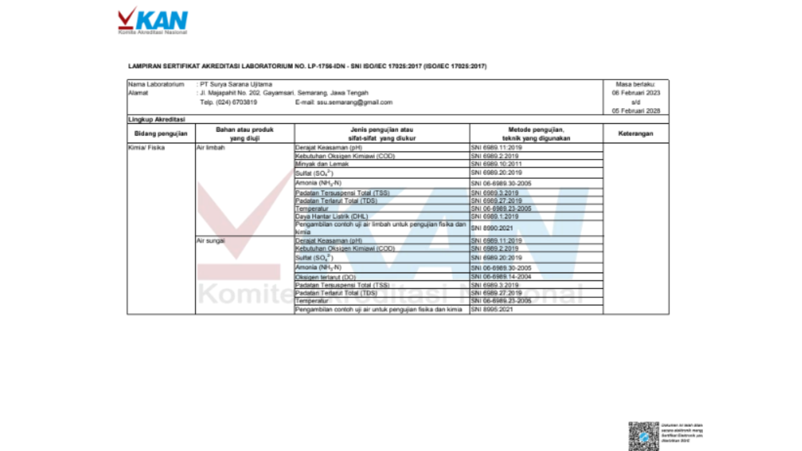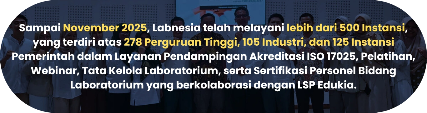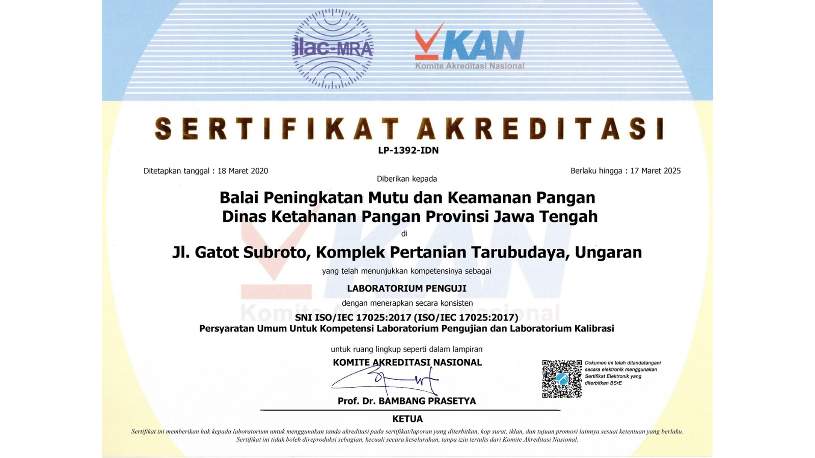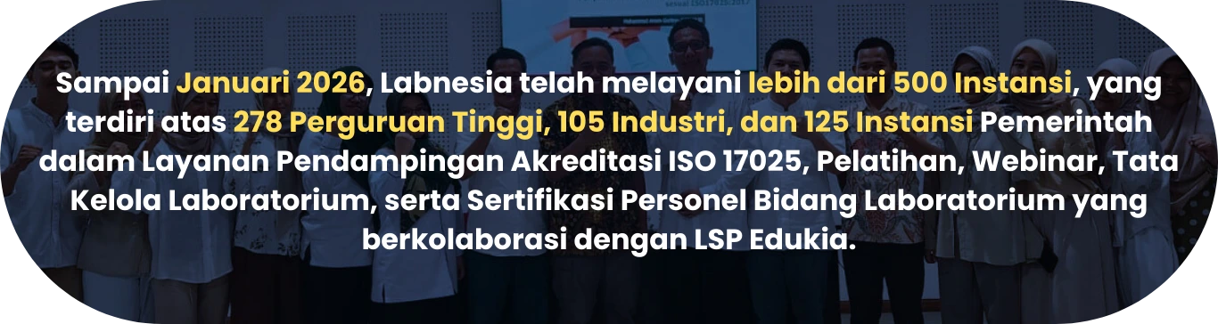 Akreditasi Laboratorium oleh Komite Akreditasi Nasional (KAN) dengan standar ISO/IEC 17025:2017 merupakan sebuah penilaian dan pengakuan bahwa suatu laboratorium memiliki kompetensi yang layak atas hasil uji atau kalibrasinya.
