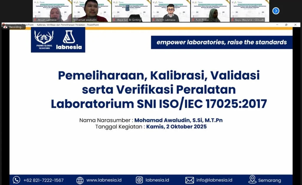 Labnesia kembali sukses menyelenggarakan kegiatan Bootcamp Standar Laboratorium Batch 3 Seri 3 dengan tema “Pelatihan Kalibrasi, Pemeliharaan, dan Validasi Peralatan Laboratorium SNI ISO/IEC 17025:2017”. Acara ini berlangsung secara online melalui Zoom Meeting pada Kamis, 2 Oktober 2025 dan berhasil menghadirkan 65 peserta dari 30 instansi berbeda di seluruh Indonesia. Pembukaan Acara Acara dibuka dengan penuh semangat […]