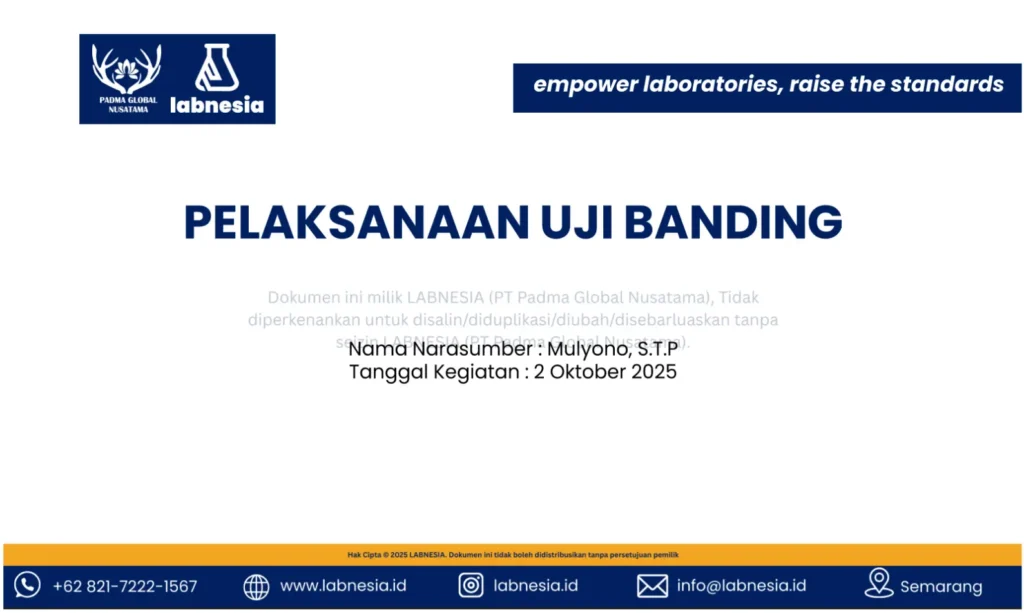 Labnesia kembali menyelenggarakan kegiatan pendampingan laboratorium dalam rangka meningkatkan mutu dan kompetensi berbasis standar internasional. Pada Kamis, 2 Oktober 2025, telah terlaksana Sesi 2 Pendampingan Uji Banding bersama PT Indonesia Asahan Aluminium (INALUM) secara sukses dan lancar. Acara ini dihadiri oleh 18 orang peserta yang berasal dari tim laboratorium PT INALUM. Kegiatan dibuka secara resmi […]