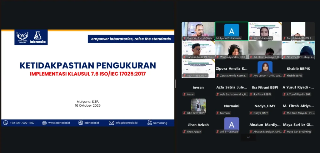 Sebagai komitmen untuk terus meningkatkan kompetensi tenaga laboratorium, Labnesia kembali menyelenggarakan kegiatan pelatihan. Program kali ini adalah Bootcamp Standar Laboratorium Batch 3 dengan tema “Evaluasi dan Estimasi Ketidakpastian Pengukuran dalam Laboratorium SNI ISO/IEC 17025:2017”. Adapun kegiatan tersebut telah sukses dilaksanakan pada Kamis, 16 Oktober 2025 secara online melalui platform Zoom Meeting. Antusiasme Tinggi Para Peserta Kegiatan […]