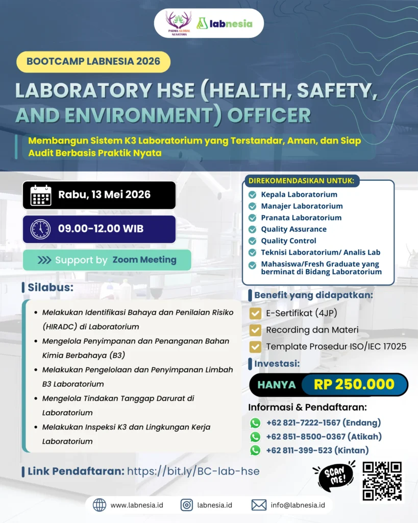 Jadi HSE Officer Lab Profesional | Bootcamp K3 Laboratorium 2026 (Siap Audit) Memuat… EVENTS All Events WEBINAR PELATIHAN Bootcamp Implementasi ISO/IEC 17025:2017 – Laboratory HSE Read More Bootcamp Implementasi ISO/IEC 17025:2017 – Laboratory Quality System Assurance Read More WEBINAR NASIONAL LABNESIA 2026: Saatnya Ubah Status Laboratorium PERGURUAN TINGGI : Dari “Cost Center” Jadi “Profit Center”! Read More Membangun Awareness K3 Laboratorium dari Pengalaman Nyata Read More Pelatihan dan Workshop Berbasis Sertifikasi-Panelis Terlatih Pengujian Sensori Pangan Read More WEBINAR NASIONAL: STRATEGI MEMBUAT CV JUARA UNTUK KARIER LABORATORIUM Read More Load More End of Content.