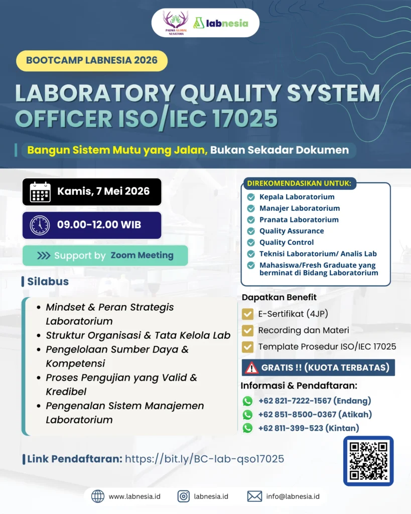 Cara Bangun Sistem Mutu Laboratorium ISO 17025 yang Efektif melalui Bootcamp Laboratory Quality System Officer ISO/IEC 17025 Memuat… EVENTS All Events WEBINAR PELATIHAN Bootcamp Implementasi ISO/IEC 17025:2017 – Laboratory Quality System Assurance Read More WEBINAR NASIONAL LABNESIA 2026: Saatnya Ubah Status Laboratorium PERGURUAN TINGGI : Dari “Cost Center” Jadi “Profit Center”! Read More Membangun Awareness K3 Laboratorium dari Pengalaman Nyata Read More Pelatihan dan Workshop Berbasis Sertifikasi-Panelis Terlatih Pengujian Sensori Pangan Read More WEBINAR NASIONAL: STRATEGI MEMBUAT CV JUARA UNTUK KARIER LABORATORIUM Read More BOOTCAMP STANDAR LABORATORIUM-BATCH 1: FUNDAMENTAL SISTEM MANAJEMEN LABORATORIUM Read More Load More End of Content.