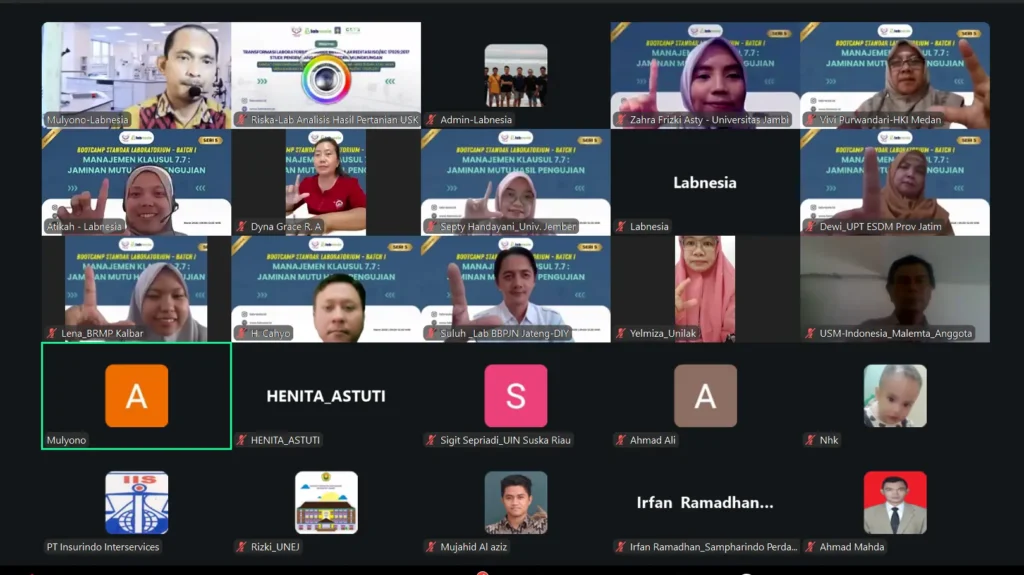 Kegiatan Bootcamp Standar Laboratorium Batch I Seri 5 dengan tema “Manajemen Klausul 7.7: Jaminan Mutu Hasil Pengujian” telah sukses diselenggerakan secara online pada Selasa, 31 Maret 2026. Program ini menarik antusiasme tinggi dengan total 101 peserta dari 30 instansi yang berasal dari berbagai sektor laboratorium pengujian dan kalibrasi di Indonesia.