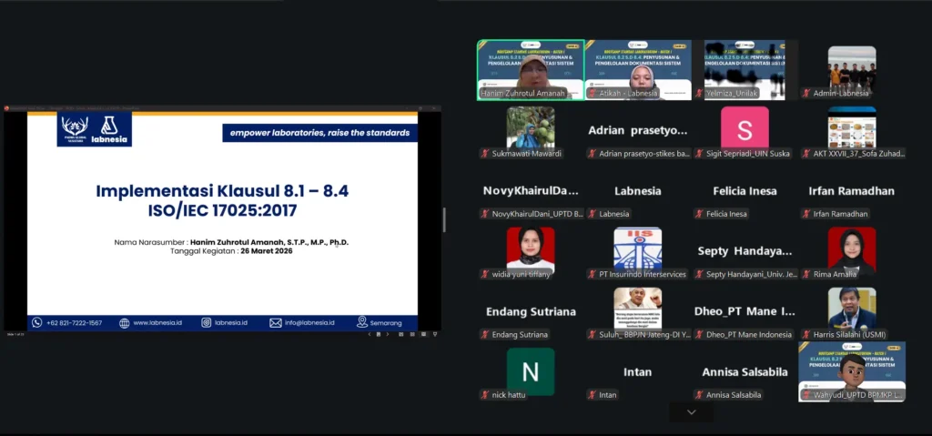 Kegiatan dilaksanakan secara online melalui Zoom Meeting pada Kamis, 26 Maret 2026, dan diikuti oleh 89 Peserta dari 27 Instansi yang berasal dari perguruan tinggi, sektor swasta, serta instansi pemerintah. Acara dibuka oleh MC Atikah Afifa Shalsabilah yang memandu jalannya kegiatan dengan profesional serta menyampaikan pentingnya pemahaman sistem dokumentasi dalam mendukung mutu laboratorium,