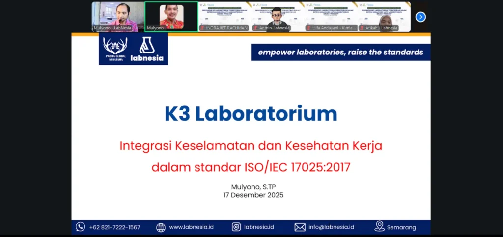 Labnesia sukses menyelenggarakan Bootcamp Standar Laboratorium Batch 4. Dengan tema “Beyond Compliance: Penerapan K3 Laboratorium Terintegrasi dalam Sistem Manajemen Mutu Laboratorium ISO/IEC 17025:2017”, kegiatan ini dilaksanakan secara online melalui Zoom Meeting pada Rabu, 17 Desember 2025, pukul 09.00 – 12.00 WIB. Bootcamp ini menjadi bootcamp penutup Labnesia sepanjang tahun 2025. Bootcamp Batch 4 ini diikuti oleh 38 peserta yang berasal dari 18 instansi, meliputi perguruan tinggi, instansi pemerintah, dan sektor industri. Tingginya partisipasi lintas sektor mencerminkan besarnya kebutuhan akan pemahaman penerapan K3 laboratorium yang terintegrasi dalam sistem manajemen mutu berbasis ISO/IEC 17025:2017. Acara dibuka dan dipandu oleh MC Atikah Afifa Shalsabilah, yang mengawali rangkaian kegiatan dengan suasana komunikatif dan penuh semangat. Sejak awal kegiatan, peserta menunjukkan antusiasme tinggi dan keterlibatan aktif dalam setiap sesi. Materi dan Narasumber Materi bootcamp disampaikan oleh Bapak Mulyono, S.T.P.. Beliau merupakan Manajer Mutu Laboratorium, Trainer, Konsultan Akreditasi, dan Pakar dari Labnesia. Dalam pemaparannya, beliau menekankan bahwa Keselamatan dan Kesehatan Kerja (K3) Laboratorium bukan sekadar kewajiban administratif, melainkan pondasi utama dalam menjaga keberlanjutan sistem manajemen mutu ISO/IEC 17025:2017. Pembahasan meliputi keterkaitan K3 dengan ISO/IEC 17025:2017. Di antaranya identifikasi bahaya dan risiko kerja di laboratorium, penyusunan kebijakan serta prosedur K3, penerapan kontrol operasional dan tanggap darurat, hingga audit internal terpadu. Materi disampaikan secara aplikatif dan relevan dengan kondisi nyata laboratorium pengujian dan kalibrasi. Antusiasme Peserta Sepanjang kegiatan berlangsung, antusiasme peserta terlihat sangat tinggi. Hal ini ditunjukkan melalui diskusi interaktif, sesi tanya jawab yang intens, serta berbagi pengalaman implementasi K3 di masing-masing instansi. Interaksi dua arah ini menjadikan bootcamp berjalan dinamis dan bernilai praktis bagi peserta. Sebagai bentuk pengakuan kompetensi, seluruh peserta yang mengikuti kegiatan hingga akhir memperoleh E-Certificate setara 4 JP. Penutup Rangkaian Bootcamp Labnesia Tahun 2025 Sebagai bootcamp terakhir di tahun 2025, kegiatan ini menjadi penutup rangkaian program peningkatan kompetensi yang diselenggarakan Labnesia sepanjang tahun. Melalui bootcamp ini, Labnesia berharap peserta mampu menerapkan K3 laboratorium secara terintegrasi dan berkelanjutan dalam sistem manajemen mutu di institusi masing – masing. Ingin mengikuti bootcamp dan pelatihan laboratorium selanjutnya bersama Labnesia? Pantau informasi terbaru melalui website dan media sosial resmi Labnesia atau hubungi kami. Serta daftarkan diri Anda pada program pelatihan berikutnya untuk meningkatkan kompetensi dan daya saing laboratorium Anda.